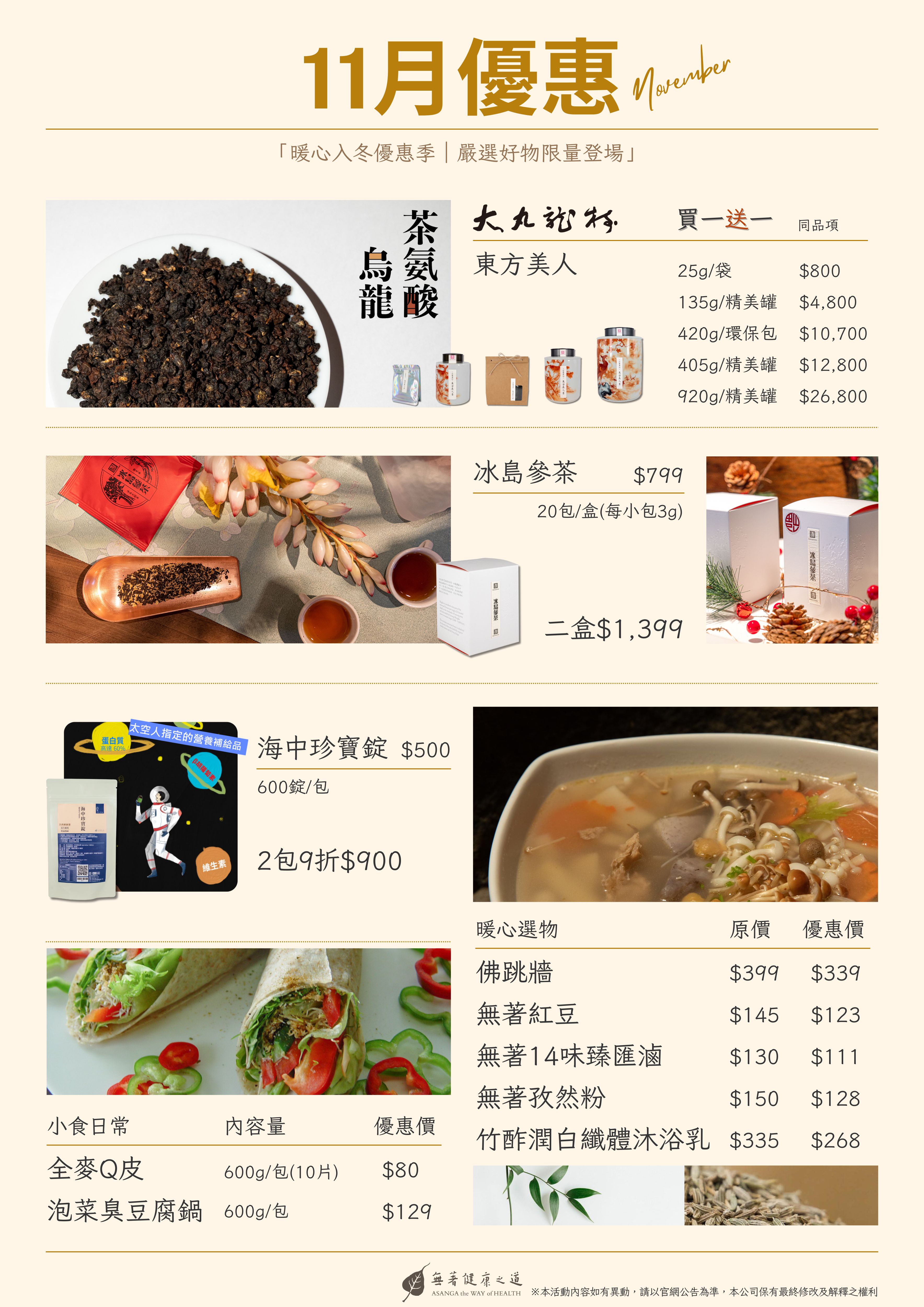 11月優惠活動 Oct 31, 25 分享 分享 分享到 網址 general.share.close general.share.copy_to_clipboard 11月優惠活動開跑囉~活動日期:2025/11/1-11/30 相關商品 本期活動商品 東方美人香2022 Regular price NT$ 800.00 - NT$ 26,800.00 Sale price NT$ 800.00 - NT$ 26,800.00 Regular price NT$ 800.00 - NT$ 26,800.00 優惠 本期活動商品 冰島參茶 Regular price NT$ 719.00 Sale price NT$ 719.00 Regular price NT$ 799.00 本期活動商品 海中珍寶.天然螺旋藻 Regular price NT$ 400.00 - NT$ 500.00 Sale price NT$ 400.00 - NT$ 500.00 Regular price NT$ 400.00 - NT$ 500.00 優惠 本期活動商品 佛跳牆 Regular price NT$ 339.00 Sale price NT$ 339.00 Regular price NT$ 399.00 優惠 本期活動商品 無著紅豆 Regular price NT$ 123.00 Sale price NT$ 123.00 Regular price NT$ 145.00 優惠 本期活動商品 無著14味臻匯滷 Regular price NT$ 111.00 Sale price NT$ 111.00 Regular price NT$ 130.00 優惠 本期活動商品 無著孜然粉 Regular price NT$ 128.00 Sale price NT$ 128.00 Regular price NT$ 150.00 優惠 本期活動商品 竹酢潤白纖體沐浴乳 Regular price NT$ 268.00 - NT$ 302.00 Sale price NT$ 268.00 - NT$ 302.00 Regular price NT$ 302.00 - NT$ 335.00 本期活動商品 全麥Q皮 Regular price NT$ 80.00 Sale price NT$ 80.00 Regular price NT$ 80.00 本期活動商品 泡菜臭豆腐鍋 Regular price NT$ 129.00 Sale price NT$ 129.00 Regular price NT$ 129.00 返回